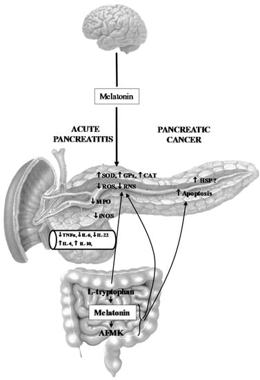 This potent favorable effect of melatonin on acute pancreatitis is not related to an individual action of melatonin, but perhaps depends on the involvement of a whole melatonin system with the contribution of the melatonin precursor l-tryptophan as well as the participation of melatonin derivatives. Our recent study has shown that one of them—melatonin metabolite AFMK—is also able to attenuate the severity of acute pancreatic inflammation. Administration of AFMK to rats prior to the induction of caerulein-induced pancreatitis significantly reduced pancreatic tissue damage in a way similar to its maternal molecule, melatonin. AFMK reduced the morphometric signs of inflammation, decreased amylase serum activity and TNFα serum concentration, and increased the antioxidant potency of pancreatic tissue, which was evidenced by the rise of the antioxidant enzyme GPx in the pancreas, accompanied by the significant decline of pancreatic lipid peroxidation products MDA + 4-HNE [].
