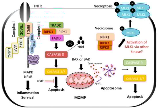 As an example, we will discuss the pathways activated upon TNFR stimulation by its ligands as it is among the most extensively studied signaling cascades in molecular biology (Figure 1). When TNF binds its receptor, multiple proteins are recruited to a membrane-bound supramolecular structure termed complex 1 or death inducing complex (DISC) [22]. These include TNFR-associated death domain (TRADD), receptor interacting protein kinase-1 (RIPK1), cellular inhibitor of apoptosis 1 and 2 (cIAP1 and 2), TNFR-associated factor 2 (TRAF2) or TRAF5 [4,23]. cIAPs, which are E3 ubiquitin ligases, catalyse the Lys63-linked polyubiquitination of RIPK1 which serves as a scaffold for NFκB activation through transforming growth factor-β-activated kinase 1 (TAK1) and TAK1-binding protein 2 and 3 (TAB2 and TAB3) [23,24]. NFκB activation leads to inflammation and cell survival [24]. For death induction, a second complex, receptor-free complex II, consists of FADD, RIPK1 or TRADD, and caspase-8 assembles in the cytoplasm [24]. Activation of the caspase-8, an initiator caspase, leads to the activation of the executioner caspases (caspase-3 and 7) [23,24]. In many cells such as hepatocytes, formation of complex II is constitutively blocked by Fas-associating protein with death domain-like interleukin-1 β-converting enzyme (FLICE) inhibitory protein (c-FLIP) and NFκB target genes such as A20 [24,25]. The robust NFκB activation in these cells renders them highly resistant to the lethal actions of TNF. However, this resistance can be overcome by translation or transcription inhibitors (such as actinomycin-D or galactosamine), generation of free radicals and reactive oxygen species (ROS), as well as glutathione (GSH) depletion [26,27,28,29].
