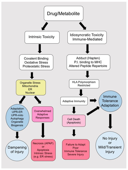 Drugs or toxic metabolites can cause intrinsic predictable toxicity by binding to intracellular proteins, generating reactive oxygen species (ROS) and inducing organelle stress. If the stress is minor, organelle adaptive responses (such as the unfolded protein responses in the ER or mitochondria) will compensate and adapt and the injury will be dampened. If these responses are overwhelmed, cell death follows. Most drugs cause an idiosyncratic and immune-mediated injury which is HLA-associated and only occurs in individuals with the susceptible HLA polymorphism. Due to the process of adaptation and the liver’s inherent capacity for immune tolerance, most individuals exposed to a toxic drug even in the presence of a susceptible HLA polymorphism will experience mild and transient injury or no injury at all. In a minority of individuals, failure of adaptation results in persistent and severe injury.