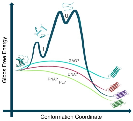 Free energy diagram representing the role of cofactors in prion protein (PrP) conformational conversion. DNA, RNA, phospholipid (PL), and glycosaminoglycan (GAG) candidates may interact with PrPC, lowering the energy barrier that prevents its spontaneous conversion to the PrPSc. Different cofactor molecules may stimulate the conversion to the different PrP pathogenic forms and may result in the generation of PrPSc with varying conformations, providing a possible explanation for the existence of various prion strains. I: intermediate state; U: unfolded state. Reproduced from [9].