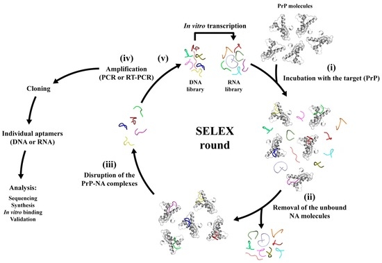 General scheme of the SELEX method using recombinant PrP as the target. A SELEX round consists of the following essential steps: (i) binding after the incubation of a randomly synthesized DNA or RNA library (containing 1014–1016 different sequences) with the molecular target (full-length recombinant PrP or other PrP constructions); (ii) removal of the non-bound NA species; (iii) elution of NA sequences from the immobilized PrP (either in-column, in ELISA dishes, or other); (iv) amplification of the eluted NA sequences; (v) back to Step (i). This process can be repeated several times to enhance the affinity and specificity of the isolated NA sequences. The final selected NA pool contains the aptamers that have to be further cloned, and individual aptamers have to be sequenced and validated for binding against its target, PrP.