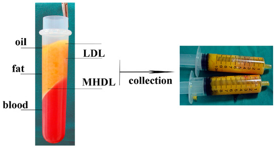 After centrifugation for 5 min at 1500 rpm, the fat sample is separated into three layers: an upper yellow layer of oil, a middle layer of adipose tissue, and a bottom layer of blood. The top and bottom layers are discarded. The middle layer is divided into two distinct layers: a low-density layer (LDL) and a middle-high-density layer (MHDL).