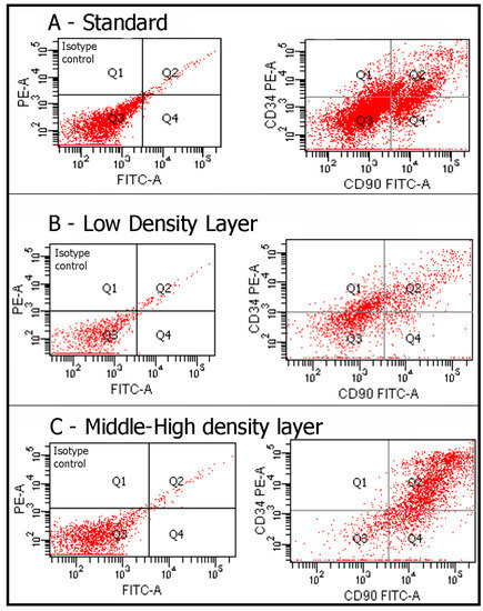 Flow cytometry analysis detected the presence of a cell population that we had previously identified [26,27,28,29]: the positive cells for these two markers were found in all layers. However, a greater number of positive CD34/CD90 cells was found in the MHDL compared to the LDL.