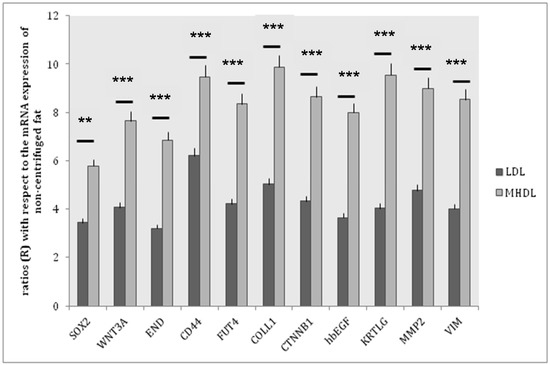Gene expression of stemness markers in the two layers. Gene expression profile of Mesenchymal Stem Cell Specific Markers in LDL (white bars), MHDL (black bars) (*** p < 0.0005; ** p < 0.0025). The results are reported as ratios (R) with respect to the mRNA expression of non-centrifuged fat (not shown).