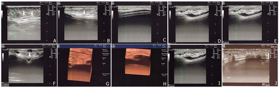 Ultrasonography figures showed a good visualization of the implanted adipose parenchyma showing internal echotexture inhomogeneous (A–C) and with the presence of small areolas hypo-anechoic with diameter max up to about 0.6 cm (F). 3D-4D scans show no structural alterations parenchyma (G,H). The prosthesis is discreetly located with irregular profiles and wavy characters without contracture, with the exception of some small areas characterized by thickening and splitting of the margin (D–F). The thickness of adipose tissue implanted is about 0.52 cm after lipofilling I and about 1.0 cm after the end of treatment (I,J).