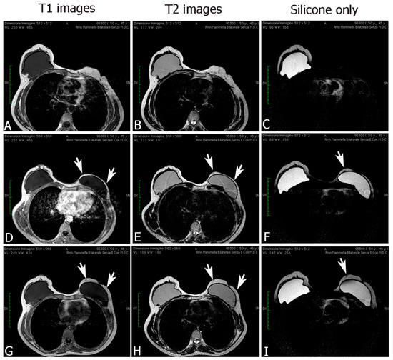 MRI figures, after fat transplantation to the breast, showed changes in volume, in thickness, and in fat distribution in the spaces (G–I) with respect to a previous treatment (D–F), and with respect to the pre-operative treatment (A–C). The fat grafting site was visible on MRI scans, with an identical signal of adjacent fat. The injected fat appearance is that of normal breast fat: hyperintense on T1- and T2-weighted sequences. On T1-weighted fat suppression images, the injected fat showed a hypointense normal fat signal. No signs of necrosis were presented on MRI.