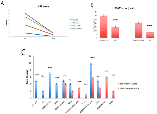 (A) Results of the patient and observer scar assessment scores at the final follow-up. The patient’s aesthetic and subjective complaints were significantly decreased for pain, pigmentation and stiffness (p = 0.0005). The observer’s scar scores were improved for all categories (p = 0.0003); (B) Total POSAS scores at the final follow-up. These improvements led to a significantly enhanced overall POSAS score in both the patient and observer *** p < 0.0005); (C) Total Vancouver scores at the final follow-up. These improvements led to a significantly enhanced overall VSS score in both the patient and observer (*** p < 0.0005; ** p < 0.0025).
