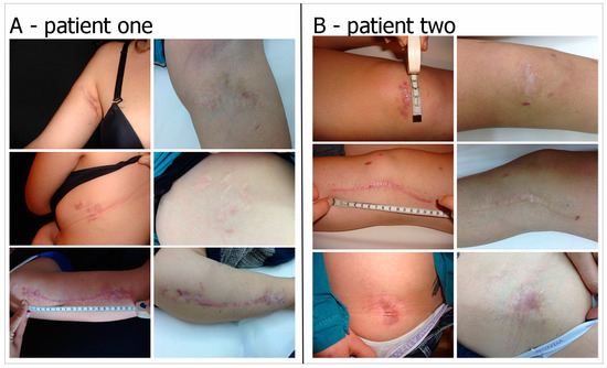 Two cases following stem cell therapy after posttraumatic scars. (A) Preoperative Posttraumatic scar on the left and postoperatively after one year of follow-up; (B) Preoperative Posttraumatic scar on the left and postoperatively after two years of follow-up.