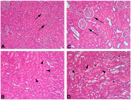 Histological sections of kidneys from Sham or 75% nephrectomized Wistar rats. Normal glomeruli (arrows) and tubules from the renal cortex are shown in panel (A) while panel (B) shows normal tubules (arrowheads) from the outer stripe of the outer medulla. Sections of renal cortex (C) and outer stripe of outer medulla (D) from a 75% nephrectomized rat are also shown. A 75% nephrectomized rat is considered to be an appropriate model of chronic kidney disease. Glomeruli (arrows (C)) from a 75% nephrectomized rat appear to be hypertrophied as a compensatory response to a reduction in renal mass. Similarly, the tubules in the outer stripe of the outer medulla (D) of the 75% nephrectomized rat also appear to be hypertrophied (arrowheads). In contrast, some tubules (*) display signs of necrosis, which is likely due to the reduced perfusion of blood to those nephrons. Magnification, 100×.