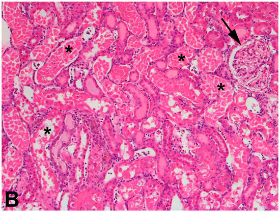Histological sections of kidneys from Sham or 75% nephrectomized Wistar rats exposed to 2.5 μmol kg−1 HgCl2. Panel (A) shows a representative section of kidney from Sham rats exposed to2.5 μmol kg−1 HgCl2. This section displays a normal glomerulus (arrow) and a mix of normal and injured tubules (*). In addition, there is an infiltration of lymphocytes, which is likely one of the first responses to the inflammation caused by exposure to mercury. Panel (B) shows a representative section of kidney from 75% nephrectomized rats exposed to 2.5 μmol kg−1 HgCl2. Glomeruli (arrows) were hypertrophied and tubular necrosis (*) was widespread. The degree of injury in the 75% nephrectomized rats was significantly greater than that in corresponding Sham rats, suggesting that rats with reduced renal mass may be more sensitive to the nephrotoxicants such as mercury, than rats with normal renal mass. Magnification, 100×.