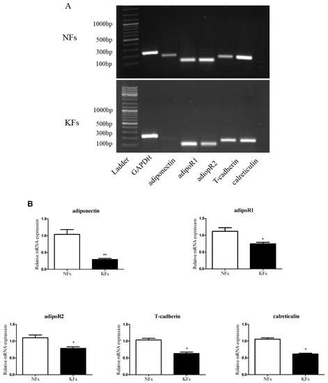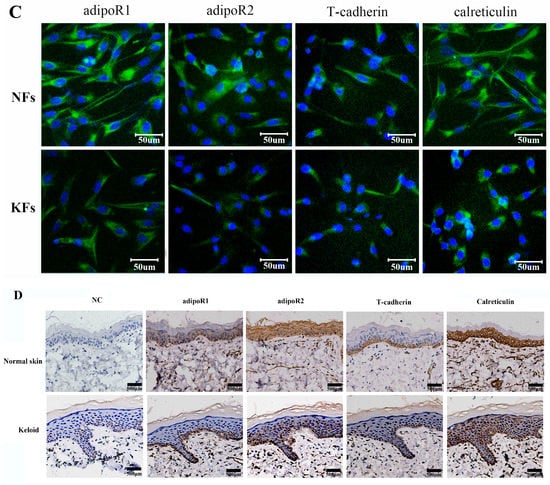 As shown in Figure 2, normal skin fibroblasts (NFs), and keloid fibroblasts (KFs) expressed both adiponectin and adipoR mRNAs (Figure 1B and Figure 2A), and their expression was also detected in cells (Figure 2C). The expression of adiponectin (Figure 2B) and adipoRs (Figure 2B,C) was significantly decreased in KFs compared with that in NFs, as determined by quantitative real-time RT-PCR and immunofluorescence staining.