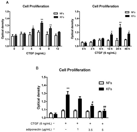 Hyperproliferation, cell migration and excess ECM accumulation are important phenotypic characteristics of KFs []. CTGF is often overexpressed during organ fibrosis and it is an important mediator of the development of keloid tissues [,]. We examined cell proliferation using the CCK-8 assay. CTGF significantly promoted KFs proliferation in a time- and dose-dependent manner, but did not change NFs proliferation. As shown in Figure 3A, KFs were stimulated with different concentrations of CTGF for different times, and KFs proliferation reached a peak level at 24 h upon stimulation with 6 ng/mL CTGF. Thus, CTGF was applied at 6 ng/mL for 24 h in the subsequent experiments.