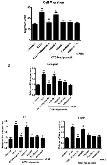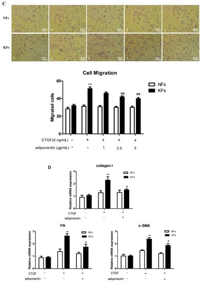 Cell migration was evaluated using the Transwell assay. CTGF promoted KFs migration compared with the control (p < 0.01), and adiponectin clearly attenuated this CTGF-induced effect, particularly at the concentration of 5 μg/mL (Figure 3C). However, there was no significant difference between the NF groups. Thus, unless indicated otherwise, adiponectin was applied at 5 μg/mL in the subsequent experiments.