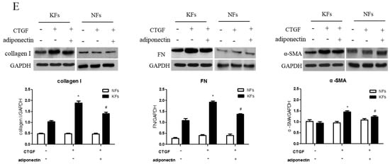 The expression levels of the collagen I, fibronectin (FN) and α-smooth muscle actin (α-SMA) mRNAs and proteins were determined by quantitative real-time RT-PCR (Figure 3D) and western blotting (Figure 3E), respectively. As the main contributors to keloid formation, the levels of the collagen I, FN and α-SMA mRNAs and proteins exhibited a substantial increase in KFs after CTGF (6 ng/mL) stimulation compared to the NFs. Furthermore, adiponectin (5 μg/mL) suppressed the upregulated expression of collagen I, FN and α-SM (p < 0.05). However, there was no difference between the NFs groups.