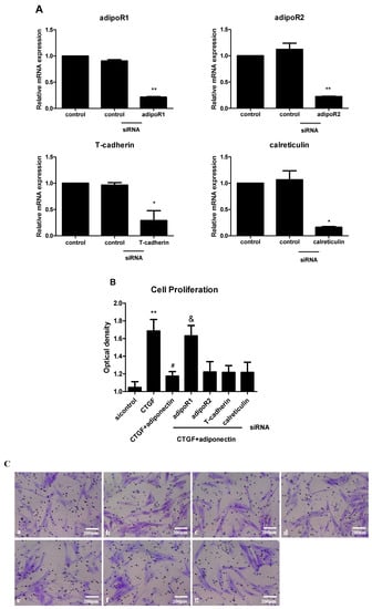 Although adipoRs were identified, their involvement in adiponectin-induced signalling pathways has not been clearly defined. KFs were transfected with siRNAs targeting the adipoRs for 24 h to evaluate the function of adiponectin and determine whether it was regulated by adipoR1, adipoR2, T-cadherin or calreticulin. The adipoR1, adipoR2, T-cadherin and calreticulin mRNA levels were significantly reduced (>75%, ** p < 0.01 for adipoR1, adipoR2 and calreticulin; * p < 0.05 for T-cadherin) compared with the levels in the control siRNA-transfected cells, as evaluated by quantitative real-time RT-PCR (Figure 4A), indicating that the gene knockdown of the adipoRs was specific. Furthermore, we next examined whether the function of adiponectin was inhibited by siRNAs targeting the adipoRs. Transfected KFs were pre-treated with or without adiponectin (5 μg/mL) in the presence of CTGF (6 ng/mL) for 24 h. Fibroblast proliferation and migration were measured in vitro with the CCK-8 (Figure 4B) and Transwell (Figure 4C) assays, respectively. The siRNA targeting adipoR1 (siadipoR1), but not the siRNAs targeting adipoR2, T-cadherin or calreticulin, effectively increased the proliferation and migration of KFs (both * p < 0.05). In addition, adipoR1 also markedly enhanced adiponectin-induced reductions in the expression levels of the collagen I, FN and α-SMA mRNAs (Figure 4D, all * p < 0.05). However, there was no difference among cells transfected with the siRNAs targeting adipoR2, T-cadherin or calreticulin. Thus, adipoR1 is involved in adiponectin-mediated signalling pathways in KFs, and the adiponectin/adipoR1 interaction may play an important role in the development of keloids.