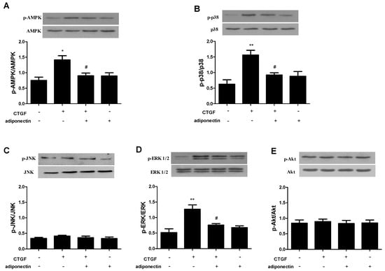 Effects of adiponectin on CTGF-induced phosphorylation of adenosine 5′-monophosphate (AMP)-activated protein kinase (AMPK), p38 mitogen-activated protein kinase (MAPK), Jun N-terminal kinase (JNK), extracellular-regulated kinase (ERK) and Akt in KFs. KFs were stimulated with CTGF (6 ng/mL) and/or adiponectin (5 μg/mL) for 24 h. The phosphorylation of AMPK (A), p38 MAPK (B), JNK (C), ERK (D) and Akt (E) in the fibroblasts was analysed by western blotting. The results are representative of three independent experiments. * p < 0.05, ** p < 0.01 compared with the control cells; # p < 0.05 compared with the CTGF-treated cells. The data are expressed as means ± SE.