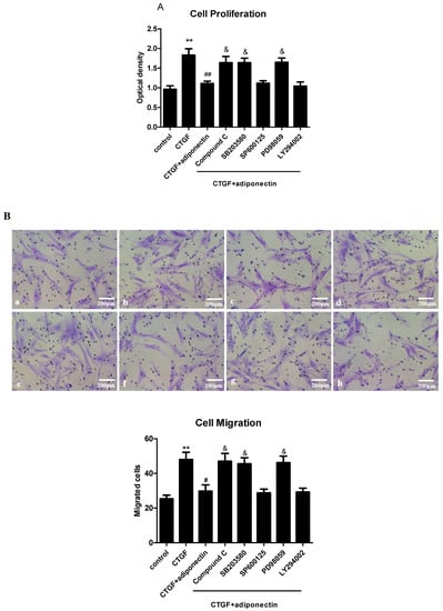 2.6. AMPK, p38 MAPK and ERK Signalling Pathways Are Involved in Adiponectin-Mediated CTGF-Induced KFs Proliferation, Migration and ECM Production