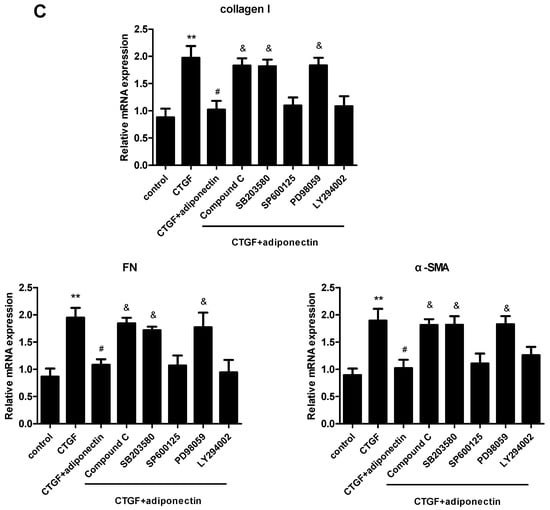 Antibodies against adipoR1, adipoR2, T-cadherin, calreticulin and α-smooth muscle actin (α-SMA) were purchased from Abcam (Cambridge, UK), and the anti-glyceraldehyde 3-phosphate dehydrogenase (GAPDH) antibody was obtained from Kangcheng (Shanghai, China). Antibodies against collagen I and FN were purchased from Boster (Wuhan, China). Antibodies against adenosine 5′-monophosphate (AMP)-activated protein kinase (AMPK), phosphorylated AMPK (p-AMPK), p38, p-p38, Jun N-terminal kinase (JNK), p-JNK, extracellular-regulated kinase (ERK), p-ERK, Akt and p-Akt were obtained from Cell Signalling Technology (Beverly, MA, USA). Compound C (10 μM, AMPK inhibitor) was obtained from Calbiochem (Merck Kgaa, Darmstadt, Germany); SB203580 (10 μM, p38 mitogen-activated protein kinase (MAPK) inhibitor) and PD98059 (10 μM, MEK inhibitor) were obtained from Sigma (St. Louis, MO, USA); SP600125 (10 μM, JNK inhibitor) and LY294002 (10 μM, phosphatidylinositol 3 kinase (PI3K) inhibitor) were purchased from Selleckchem (Houston, TX, USA). Recombinant human CTGF was obtained from Prospec-Tany Technogene (Ness Ziona, Israel) and recombinant human adiponectin was purchased from Sino Biological (Beijing, China).