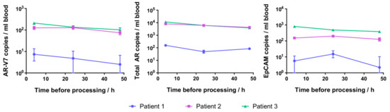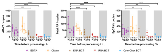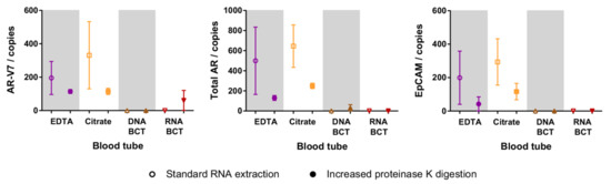 Luk, A.W.S.; Ma, Y.; Ding, P.N.; Young, F.P.; Chua, W.; Balakrishnar, B.; Dransfield, D.T.; Souza, P.d.; Becker, T.M. CTC-mRNA (AR-V7) Analysis from Blood Samples—Impact of Blood Collection Tube and Storage Time. Int. J. Mol. Sci. 2017, 18, 1047. https://doi.org/10.3390/ijms18051047