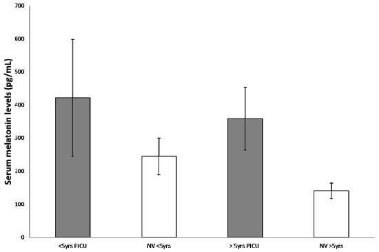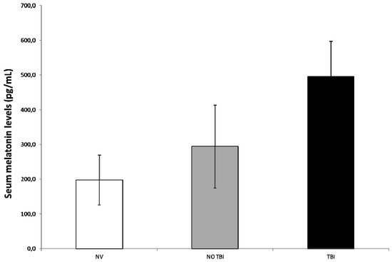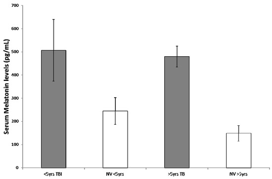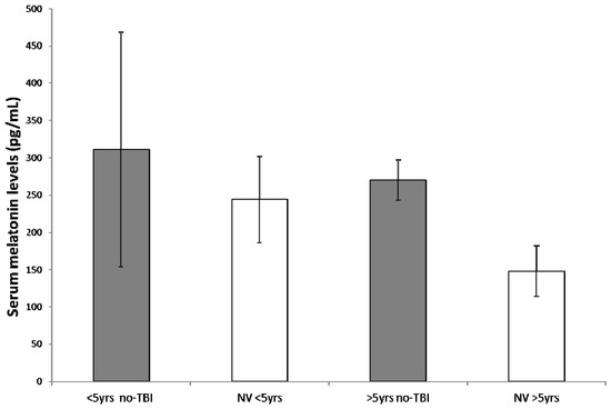 Both in children younger and older than five years within the traumatic brain injury (TBI) group, mean serum melatonin levels were significantly higher than normal literature values (NV), highlighting the role of head injury on the endogenous melatonin secretion.