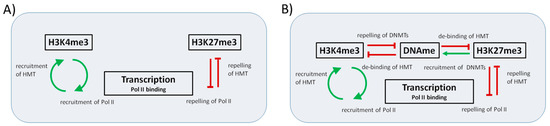 Sketch of the interactions within the regulatory circuit. (A) The simplified model version MV1 focuses on the interaction between histone modification and transcription, while effects of DNA methylation are neglected. We consider a positive feedback (green arrows) between H3K4me3 and transcription and a negative one (red T bars) between H3K27me3 and transcription; (B) In an extended model version MV2, both histone modifications are considered to be suppressed by DNA methylation that weakens binding of the respective HTMs. H3K4me3 suppresses DNA methylation by suppressing DNA methyltransferase (DNMT) recruitment, while H3K27me3 recruits DNMTs.