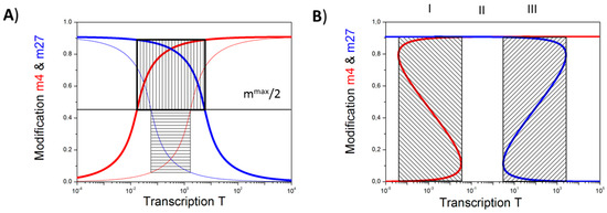 In our model each value of the H3K4me3 modification level (m4) and the H3K27me3 modification level (m27) is associated with a well-defined transcription level T1(m4) and T2(m27), respectively, via a self-consistent equation. In contrast, due to potential bi-stability of the modifications, a specific transcription level can be associated with either one or three different modification levels (compare: Figure 2). The explicit functions T1(m4) and T2(m27) used in our model are given in the Appendix A. All modification states, i.e., all pairs {m4*, m27*}, which can be realized given a particular organization of the histone modification machinery, need to solve the equation: