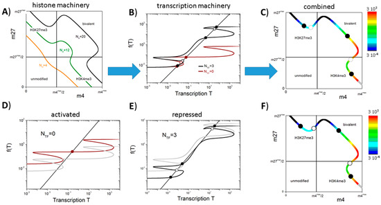 The bivalent state in MV1: (A) Shown are the possible pairs {m4*, m27*} applying parameter set {X} for different numbers (NH = 4 (orange), 12 (green), and 20 (black)) of the cooperative nucleosomes associated with the promoter. The range of m4 and m27 is exponentially spread approaching its maximum and minimum values (see: Appendix A). The boxes indicate the specific modification states; (B) Transcription states derived applying parameter set {Y} for NH = 20 without (brown: NTF = 0) and with (black: NTF = 3) transcriptional auto-feedback. The solutions are given as the intersections of the functions g with the function y = x (dots); (C) Solutions of Equations (1)–(3) in the {m4, m27} space. The solid (open) dots on the curve indicate the stable (unstable) fix points for NTF = 3. The transcriptional level of all other pairs is color coded; (D) Transcriptional activation (brown line, FTF = 4); and (E) repression (black line, FTF = 1/4) changes the solutions quantitatively as well as qualitatively. (D,E) References (FTF = 1) are shown as grey lines; (F) Solutions of Equations (1)–(3) and fix points for the system shown in (E).