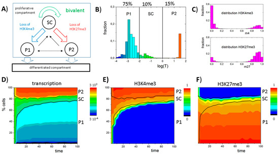 Starting from a homogeneous cell population of bivalent SCs, over time a heterogeneous, albeit dynamically stabilized cell population is established. This heterogeneity inherently emerges due to a random loss of H3K4me3 or H3K27me3 modifications in individual cells after cell division, which leads to bimodal H3K4me3 and H3K27me3 distributions as shown in Figure 4C. As transitions from the bivalent to a monovalent histone modification state are directly linked to changes in gene expression, the different cell types can also be distinguished based on their transcriptional activity (Figure 4B). In the model, bivalent SCs are characterized by an intermediate transcription (0.01 < T < 1), while P1 cells express low levels (T < 0.01) and P2 cells high levels (T > 1) of GATA3 (Figure 4B) closely mimicking experimental results. In contrast to typical flow cytometry measurements, which can only provide a snapshot of the population heterogeneity, computer simulations allow monitoring the dynamic changes of transcriptional (Figure 4D) and epigenetic states (Figure 4E,F) over time. It can be seen that the heterogeneity of the cell population remains long-term stable.