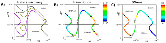 Figure 5A shows all possible pairs {m4*, m27*} for such a regulatory system, using the same parameter set as in the unmethylated system (Figure 3A–C) for a fixed number of cooperatively acting nucleosomes (NH = 20). It can be seen that with increasing de novo DNA methylation activity unmodified states become possible, where the nucleosomes carry neither H3K4me3 nor H3K27me3. For the system with a de novo DNA methylation probability of 0.3, four stable states are observed (Figure 5B,C); among them, two intermediate expressing states that are distinguished by their DNA methylation level. The bivalent state shows low, while the unmodified state shows high methylation.