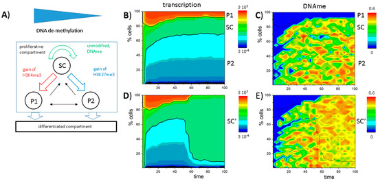 To model blast formation, we assume that active DNA demethylation is no longer functional, e.g., according to mutations in the gene encoding TET2 [40]. Consequently, the promoter of the PU.1 gene, as other promoters being under the control of active DNA demethylation by TET2-proteins, becomes methylated independent of the expression of PU.1. This results in complete de-modification of the PU.1 promoter also in cells where PU.1 is expressed under normal conditions. The affected cells express PU.1 at an intermediate level and thus are assumed to remain in the expansive niche (see cell type definition). This copes the phenotype known from so-called “blast cells” (SC′), which show PU.1 hypermethylation and are proliferative active [41]. Simulations of the system (Figure 6D,E and Appendix F, Figure A5E,F) actually show that nearly all cells become fixed in the unmodified and DNA methylated state immediately after the TET2 mutation is induced (t = 50).