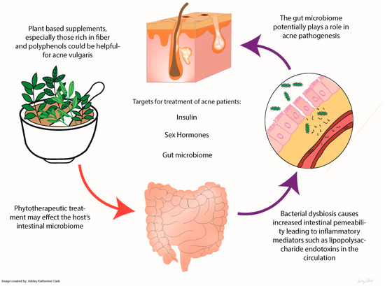 Acne affects between 40 and 50 million individuals in the United States [1], including mainly adolescents and adults. Factors influencing acne development include excessive sebum production, follicular hyperkeratinization of pilosebaceous ducts, and an increased release of inflammatory mediators. Additionally, some have hypothesized that androgens and microbial colonization with Propionibacterium acnes contribute to the pathogenesis of acne [2,3]. The role of P. acnes is not clear, as this bacterium is ubiquitous. However, certain strains of acne may be more associated with acne and be pro-inflammatory [4,5,6]. Regardless of the ongoing debate regarding P. acnes, antibiotics used in the treatment of acne appear to have anti-inflammatory effects independent of their antimicrobial effects [7,8,9]. As a result, the first-line treatment of acne involves broad-spectrum oral and topical antibiotics, which require protracted treatments of a minimum of 3–6 months. Chronic antibiotics may have long-term side effects and detrimental effects on the host microbiome, including selection for multidrug resistant bacteria on the skin and in the gut [10]. For example, the use of clindamycin has been associated with pseudomembranous colitis [11], tetracycline has been shown to change skin color, and erythromycin can precipitate hepatic dysfunction [12]. Other medications used for acne such as isotretinoin, while effective, require close monitoring and have many side effects, including a risk of teratogenicity [13]. Therefore, there is a need for safe and effective alternatives to treat acne. Plant-based approaches have been practiced in multiple medical perspectives, including Chinese medicine and Ayurveda. Our understanding of medicinal plant efficacy and their mechanisms is growing as demand for natural, holistic approaches and fears over the ramifications of chronic antibiotic use increase. Here, we discuss the importance of the gut microbiome in acne pathogenesis and the potential for phytotherapeutic treatments (Table 1).