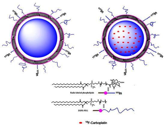 Although this approach enabled imaging of delivery vehicles, in terms of blood circulation and biodistribution kinetics of radiolabeled vehicles, it does not report on the imaging of drug release, uptake, and retention in tumors. Direct in vivo imaging of encapsulated agents requires the incorporation of radiolabeled drugs that can be distinctively imaged from the radiolabeled vehicle. This approach, for example, can be accomplished by radiolabeling a carrier, like liposomes, with a SPECT radionuclide, such as 111In or 99mTc, encapsulating a PET radiolabeled drug with 18F, for example, or another PET radionuclide. In this way, the dual radiotracer approach will be more informative in that the right amount of drug reaching and retaining in the tumor target can be directly and quantitatively determined from the imaging data. It will also be capable of directly relating the in vivo biodistribution kinetics of both the radiolabeled drug and the radiolabeled liposomal carrier. Liposomes, as drug carriers, have been radiolabeled with various SPECT radionuclide chelates and their biodistribution and pharmacokinetics were studied by imaging [12,13,14,15,16,17,18,19]. Recent work has also exploited longer-lived PET radionuclides, such as 64Cu, 89Zr, and 52Mn, which were used to radiolabel liposomes [20,21,22,23].