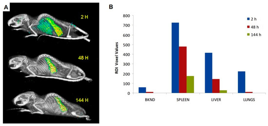 In vivo SPECT images (A) of normal nude mouse injected with [111In]-Liposome through the tail vein and imaged at 2, 48, and 144 h post-injection. Initial high uptake in the RES tissues was significantly reduced at later time points. Relative radioactive signal intensity of [111In]-Liposome in the spleen, liver, and lungs, compared to a background region on the image, is shown. All regions were determined by regions of interest (ROI) analysis of SPECT images (B).