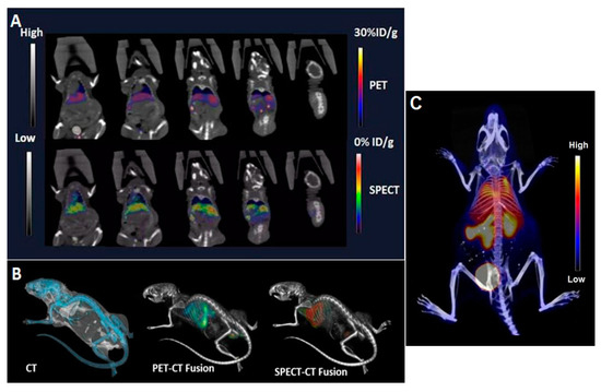 The unique in vivo information provided by molecular imaging has the capacity to improve the overall efficacy of cancer treatment. There is growing demand by physicians, patients, and the community as a whole for personalized healthcare, and molecular imaging is well-positioned to play a major role in the era of precision medicine. Molecular imaging will become more and more multi-modal in nature, as different anatomical and molecular imaging techniques merge to complement each other. Already 18F-Fluorodeoxyglucose positron emission tomography ([18F]-FDG-PET) is integrated with cross-sectional imaging, in the form of positron emission tomography/computed tomography (PET/CT), which is commonly used in the management of cancer patients. It is inevitable that other molecular imaging technologies, such as molecular resonance imaging/molecular resonance spectroscopy (MRI/MRS), PET, SPECT, and photoacoustic imaging, will be combined to better assess multiple biological factors contributing to disease progression and the working of therapies. With the advancement of targeted multi-modality molecular imaging, it is likely that molecular imaging will provide a personalized molecular fingerprint of individual tumors, as the basis for “tailor made” novel individualized treatment strategies. Furthermore, molecular imaging will rationally facilitate not only the development of new drugs, but also revisit how current drug therapies can be better directed to the individual patient needs in terms of determining the responders and the cost-benefit for each individual patient. Image-guided anti-cancer drug delivery has been under intense recent investigations aimed at better delivery, controlled release, and enhanced retention in the tumor [1,2,3,4,5,6,7]. Radiolabeled pegylated liposomes, encapsulating chemotherapeutic agents, such as doxorubicin, have been investigated in preclinical and clinical settings to monitor the delivery and tissue distribution following systemic administration of drug-encapsulated radiolabeled liposomes [8,9,10,11].