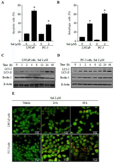 Salinomycin (Sal) induces both apoptosis and autophagy in human prostate cancer cells. (A) Apoptosis induction. Flow cytometric analysis of annexin-V/propidium iodide (PI) staining; and (B) autophagy induction. Flow cytometric analysis of acridine orange (AO) staining. LNCaP and PC-3 cells were treated with 2 µM salinomycin for 48 h; (C,D) LC3 and Beclin-1 expression; (C) LNCaP cells; and (D) PC-3 cells. Cells were treated with 2 µM salinomycin for the indicated times. After treatment, total cell lysates were subjected to SDS-PAGE for Western blot analysis; and (E) acidic vesicular detection. After treatment with 2 µM salinomycin for the indicated times, cells were stained with AO, and then cells were visualized using a laser scanning confocal microscope. Magnification, 600×. All data were representative of at least three independent experiments. Data were shown as the mean ± SD. * p < 0.05.