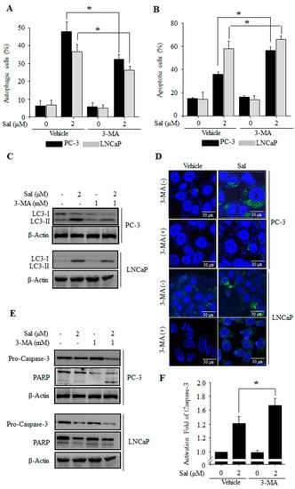 To further confirm the involvement of autophagy in salinomycin-induced apoptosis, we evaluated the effects of 3-methyladenine (3-MA), an autophagy inhibitor. Salinomycin-induced autophagy was significantly inhibited by 3-MA in both PC-3 and LNCaP cells (Figure 2A). Furthermore, salinomycin-induced apoptosis were enhanced by autophagy inhibition (Figure 2B). Additionally, we confirmed by Western blot and confocal microscopy analysis that the appearance of punctate LC-3B dots was inhibited in 3-MA pretreated cells (Figure 2C,D). Additionally, salinomycin-induced caspase-3 activation and poly (ADP-ribose) polymerase (PARP) protein cleavage were enhanced by autophagy inhibition (Figure 2E,F). Taken together, the results indicated that salinomycin-induced autophagy protects against apoptosis in prostate cancer cells and inhibition of autophagy subsequently enhances apoptosis through caspase activation in prostate cancer cells.