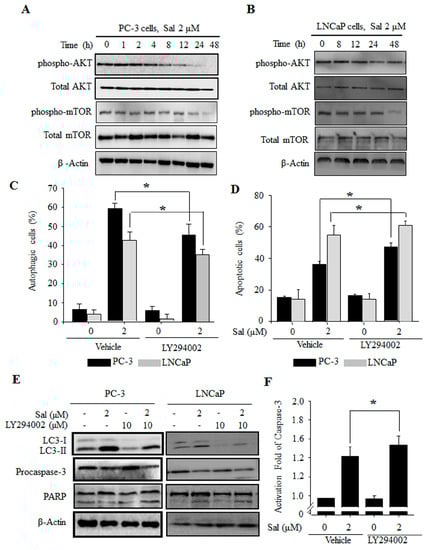 The PI3K/AKT/mTOR pathway is involved in the regulation of both salinomycin-induced autophagy and apoptosis in prostate cancer cells. (A,B) AKT/mTOR expression. (A) PC-3 cells. (B) LNCaP cells. Cells were treated with 2 µM salinomycin for the indicated times. After treatment, total cell lysates were subjected to SDS-PAGE for Western blot analysis; (C) the effects of LY294002 on salinomycin-induced autophagy. Cells were pretreated with 10 µM LY294002 for 1 h, and acridine orange (AO) stained cells were evaluated by flow cytometry; (D) the effects of LY294002 on salinomycin-induced apoptosis. Cells were pretreated with 10 µM LY294002 for 1 h, and annexin-V-FITC stained cells were evaluated by flow cytometry; (E) the Effects of LY294002 on LC3, procaspase-3 and PARP protein expression. Cells were pretreated with 10 µM LY294002 for 1 h, and then the proteins were detected by Western blot analysis; and (F) the effect of LY294002 on caspase-3 activity. PC-3 cells were pretreated with 10 µM LY294002 for 1 h, and the proteins were detected by a caspase-3 colorimetric assay kit. All data were representative of at least three independent experiments. Data were shown as the mean ± SD. * p < 0.05.