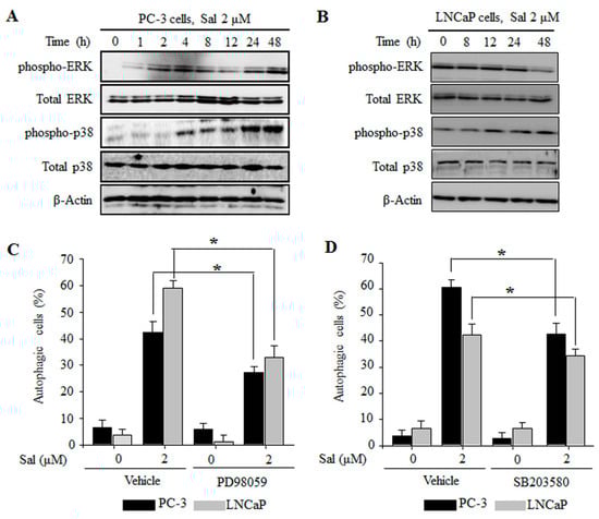 Several reports have been shown that MAPK signaling pathways are involved in the regulation of autophagy []. We found that salinomycin activated extracellular signal-regulated kinases (ERK) and p38 MAPK in a time-dependent manner in both PC-3 and LNCaP cells (Figure 4A,B). However, JNK expression was not changed (data not shown). To further confirm whether regulation of the MAPK pathway affects salinomycin-induced autophagy in prostate cancer cells, we used AO staining and Western blot analysis. Both PD98059, an ERK inhibitor, and SB203580, a p38 inhibitor, decreased salinomycin-induced autophagy in both PC-3 and LNCaP cells (Figure 4C,D). Additionally, protein expression of the autophagy marker LC3 was recovered (data not shown). These results showed that ERK and p38 MAPK activation are closely linked to salinomycin-induced autophagy in prostate cancer cells.