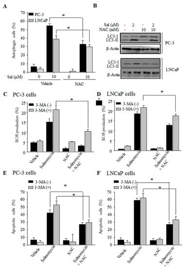 Autophagy inhibition stimulates ROS production in prostate cancer cells. (A) Effects of NAC on salinomycin-induced autophagy. Cells were pretreated with 10 mM NAC for 1 h, and acridine orange (AO) stained cells were evaluated by flow cytometry; (B) the effects of NAC on LC-3 protein expression. Cells were pretreated with 10 mM NAC for 1 h, and total cell lysates were subjected to SDS-PAGE forW blot analysis; (C,D) the effects of 3-MA on salinomycin-induced ROS production. (C) PC-3 cells; (D) LNCaP cells; and (E,F) the effects of 3-MA on ROS-mediated salinomycin-induced apoptosis. (E) PC-3 cells. (F) LNCaP cells. Cells were pretreated alone or with a combination of 1 mM 3-MA and 10 µM NAC for 1 h, and then annexin-V-FITC or DCF-DA stained cells were evaluated by flow cytometry. All data were representative of at least three independent experiments. Data were shown as the mean ± SD. * p < 0.05.