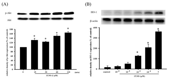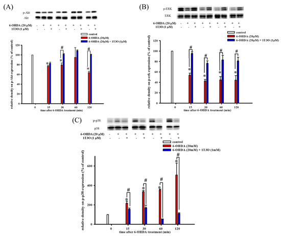 2.3. Effect of 1T3O on the Akt (Phospho-Akt), Phospho-Extracellular Signal-Regulated Kinase (Phospho-ERK), and Phospho-p38 Protein Expression in SH-SY5Y Cells