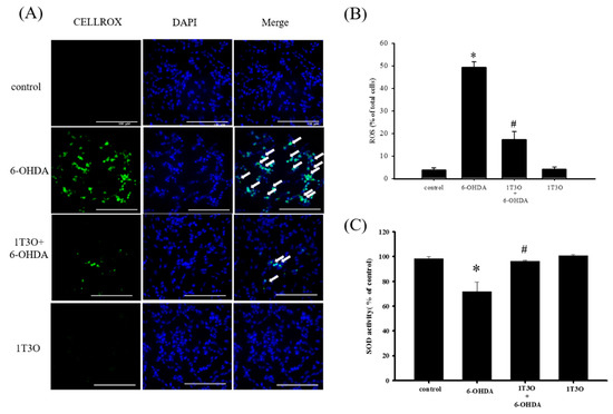 2.5. Effect of 1T3O on 6-OHD-Induced Increase in Oxidative Stress in SH-SY5Y Cells