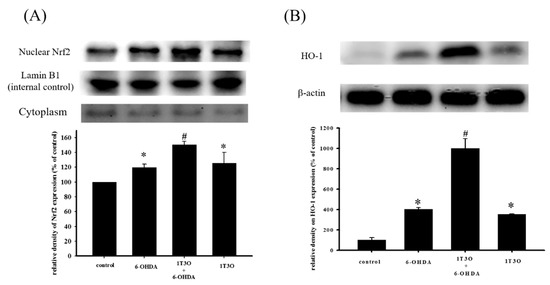 2.6. Effect of 1T3O on 6-OHDA-Induced Changes in Proteins Related to the Akt/Nrf2 Signaling Pathway of SH-SY5Y Neuroblastomas