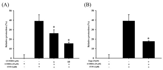 2.7. Attenuation of the Neuroprotective Effect of 1T3O by LY294002 and Zinc Protoporphyrin (ZnPP)