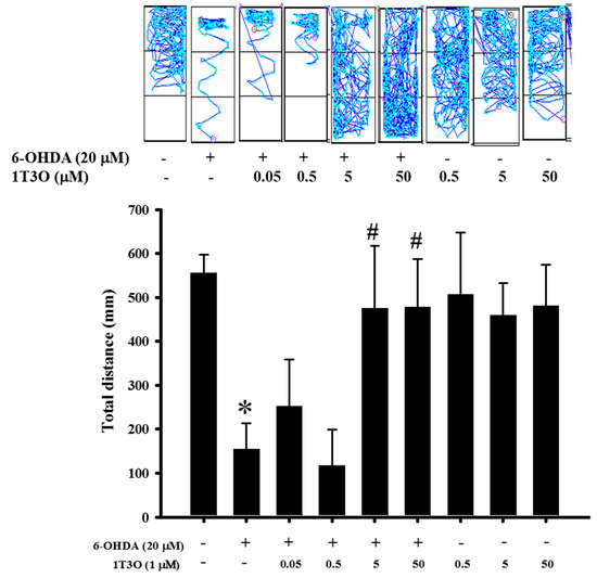 2.9. Effect of 1T3O on 6-OHDA-Induced Deficits in Zebrafish Locomotor Activity