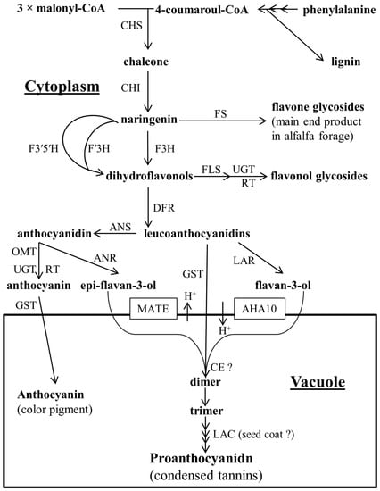 Biosynthetic pathway for anthocyanin and proanthocyanidin. Abbreviations for enzymes involved in the flavonoid pathway towards the synthesis of proanthocyanidin are as follows. CHS: chalcone synthase; CHI: chalcone isomerase; FS: flavone synthase; F3H: flavanone-3-hydroxylase; F′3H: flavonoid 3′ hydroxylase; F3′5′H: flavonoid 3′5′ hydroxylase; FLS: flavonoid synthase; UGT: UDP-dependent glucosyltransferase; RT: rhamnosyl transferase; DFR: dihydroflavonol 4-reductase; ANS: anthocyanidin synthase; ANR: anthocyanidin reductase; LAR: leucoanthocyanidin reductase; OMT: O-methyltransferase; GST: glutathione S transferase; MATE: multidrug and toxic compound extrusion-type transporter; AHA10: plasma membrane H+-ATPase; CE: condensing enzyme; and LAC: laccase-like flavonoid oxidase, ?: unknown. This figure was prepared with information obtained from Kleindt et al. [12] and Zhao et al. [13].