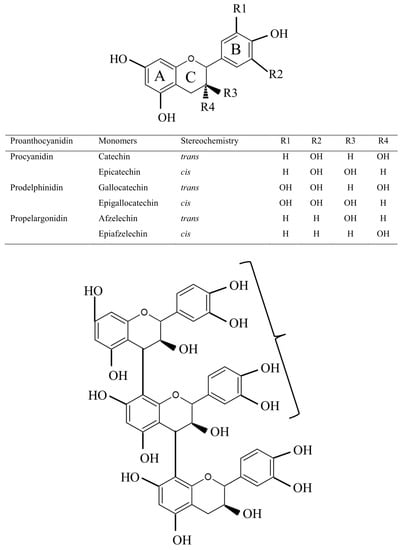 Protein precipitation by proanthocyanidins is mostly based on hydrogen bonding between the hydroxyl groups (–OH) of proanthocyanidin and the amino group (–NH) of peptides or other substrates [48] or is due to hydrophobic interactions between the phenol ring of proanthocyanidin and the carboxyl group (–COOH) of protein. Ionic interaction and covalent bonding occurs less frequently [3]. Proanthocyanidins can also bind to metals, essential amino acids, carbohydrates, digestive enzymes, and microbes, but with a lower affinity than that used to bind to dietary protein [49,50]. The composition of proanthocyanidin varies with the type of linkage between the flavonoid monomers (C4 to C6 or C4 to C8) and with stereochemical variation at carbons 2, 3 and 4 and the number of hydroxyl groups on the A and the B rings (Figure 2). These differences in proanthocyanidin composition affect their molecular structure and influence their capability to interact with other molecules such as protein.