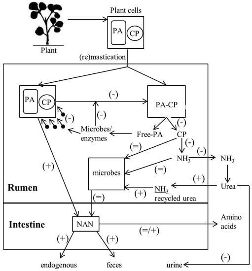 Schematic flow chart of crude protein (CP) digestion from proanthocyanidin (PA)-containing forage. Symbols between brackets represent the effect of PA-containing vs. PA-free forage on protein flow: + represents increased flow, − represents decreased flow and = represents similar flow. NAN: non-ammonia N. This figure was prepared with information from references [38,39,45,46,47].