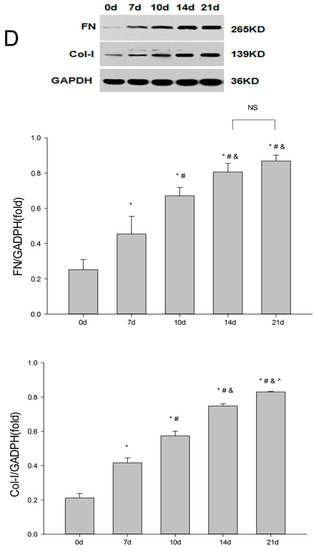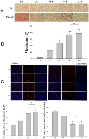 At 7, 10, 14, or 21 days after UUO, rats were killed and their kidneys harvested to analyze fibrosis. In the sham group, the structure of the kidney was normal; the renal tubules were arranged closely and orderly, the basement membrane was smooth and continuous, and there was no inflammatory cell infiltration of the interstitial area. After UUO, the kidney on the obstructed side was enlarged while renal parenchyma was thinned. Seven days after the operation, there was a large number of patchy inflammatory cell infiltrates in the renal interstitium, moderate to severe dilatation of the renal tubules, portions of distal tubular atrophy, luminal occlusion, renal tubule epithelial cell swelling and degeneration, and renal interstitial edema and broadening, showing mild fibrous tissue proliferation. Moreover, with prolonged obstruction, the above phenomena were further aggravated (Figure 1A). Masson’s trichrome staining (MTS) revealed that, in the sham group, the linear distribution of blue interstitial collagen fibers can only be seen in the renal tubular basement membrane. In the UUO group, as time passed, the blue interstitial collagen fibers gradually increased, suggesting progressive fibrosis (Figure 1A,B). Moreover, immunofluorescence demonstrated that the expression of E-cadherin decreased while α-SMA increased (Figure 1C). Immunohistochemistry revealed that the expression of fibronectin (FN) and collagen I (Col-I) increased with the time of obstruction (Figure 1E), consistent with western blot data (Figure 1D). However, there was no statistically significant difference in FN between the 14-day group and 21-day group (p = 0.242). Given that at 14 days post-obstruction renal fibrosis was already evident, we selected 14 days as the endpoint at which to analyze fibrosis in the subsequent experiments.