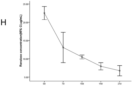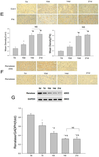 To observe the relationship between fibrosis and renalase, we first investigated the expression level of renalase in the kidney. Immunohistochemistry showed that, in 8-week-old rats, renalase was mainly distributed in the renal tubules under normal conditions. There was also significant expression in glomerular mesangial areas (Figure 1F). After UUO, with the aggravation of fibrosis, the expression of renalase was gradually decreased, both in the kidney (Figure 1F,G) and in plasma (Figure 1H).