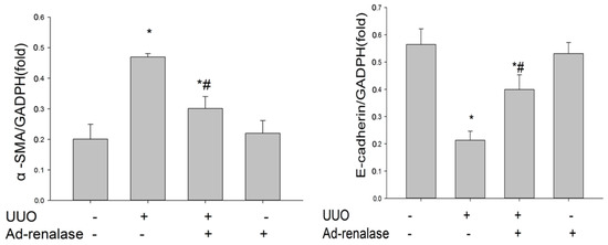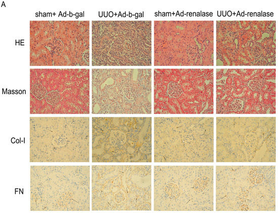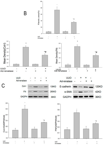 In order to observe the degree of interstitial fibrosis, kidney tissues of rats were stained with MTS. Renal interstitial fibrosis in Ad-renalase-treated rats was significantly reduced compared with that in Ad-b-gal-treated UUO rats and UUO-alone rats, as shown in Figure 2A,B. Consistent with the histological data, protein levels of fibrosis markers, including Col-I and FN, were significantly higher in the remnant kidneys of Ad-b-gal-treated UUO rats than in those of Ad-renalase-treated UUO and sham rats (Figure 2A,C). Moreover, EMT was significantly more obvious in the remnant kidneys of Ad-b-gal-treated UUO rats than in those of Ad-renalase-treated UUO and sham rats. Specifically, the expression of α-SMA was higher and the expression of E-cadherin was lower in the remnant kidneys of Ad-b-gal-treated UUO rats than in those of Ad-renalase-treated UUO and sham rats (Figure 2C). However, protein levels of fibrosis markers in Ad-renalase-treated UUO rats were still higher than sham rats (Figure 2A,C).